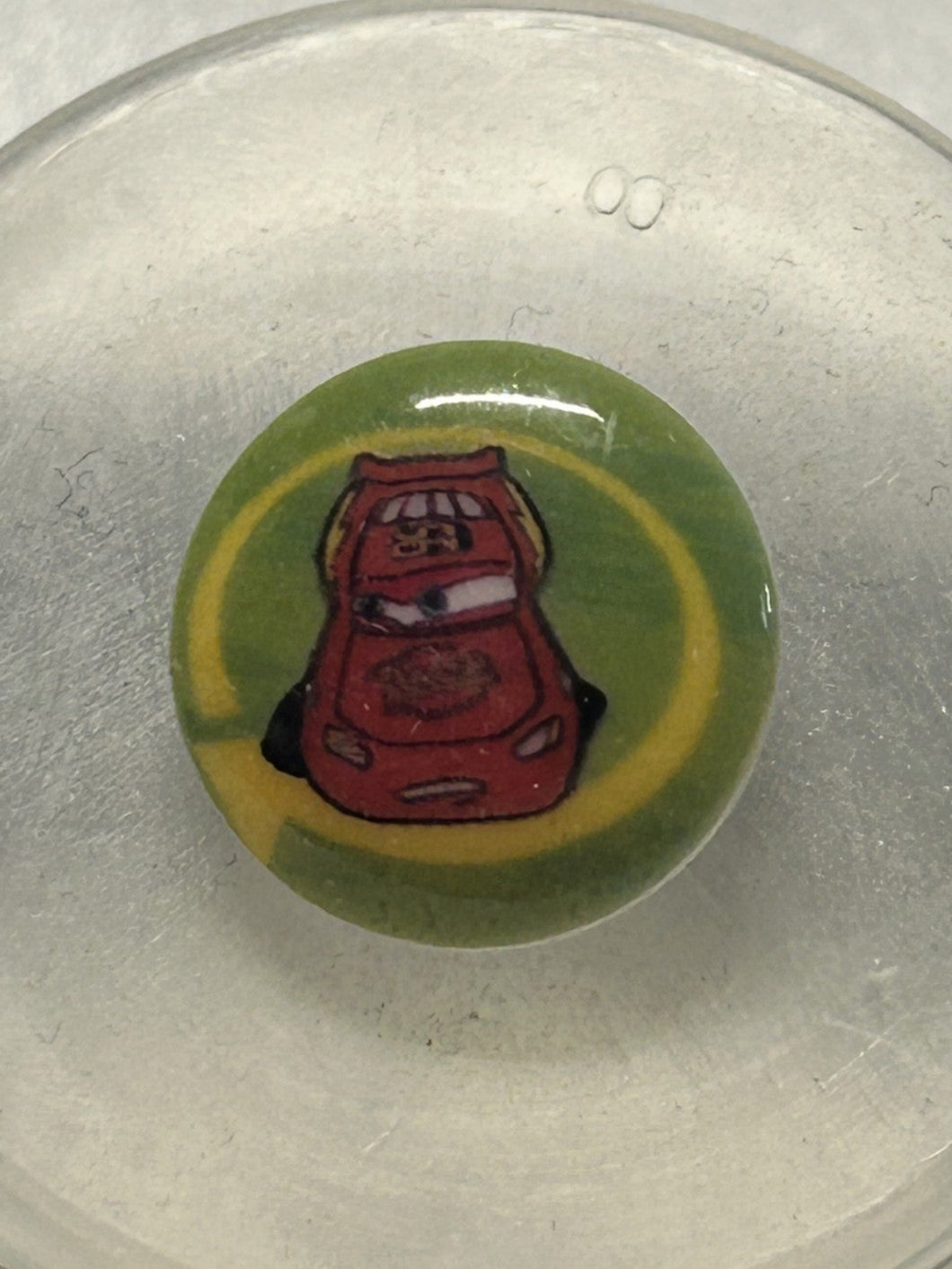bottone originale DISNEY marcato con logo nella parte posteriore, diametro 15 mm. , base verde con SAETTA di Cars nella parte centrale , da cucire a mano (cucitura interna - nessun foro a vista) € 2,5 / cad.