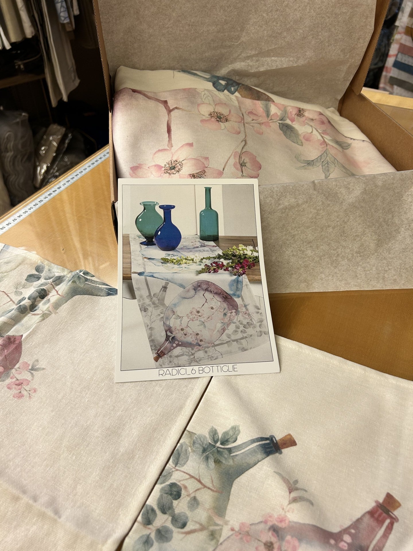 completo tovaglia 8 persone + 8 tovaglioli "BOTTIGLIE", Tessitura RANDI 1931