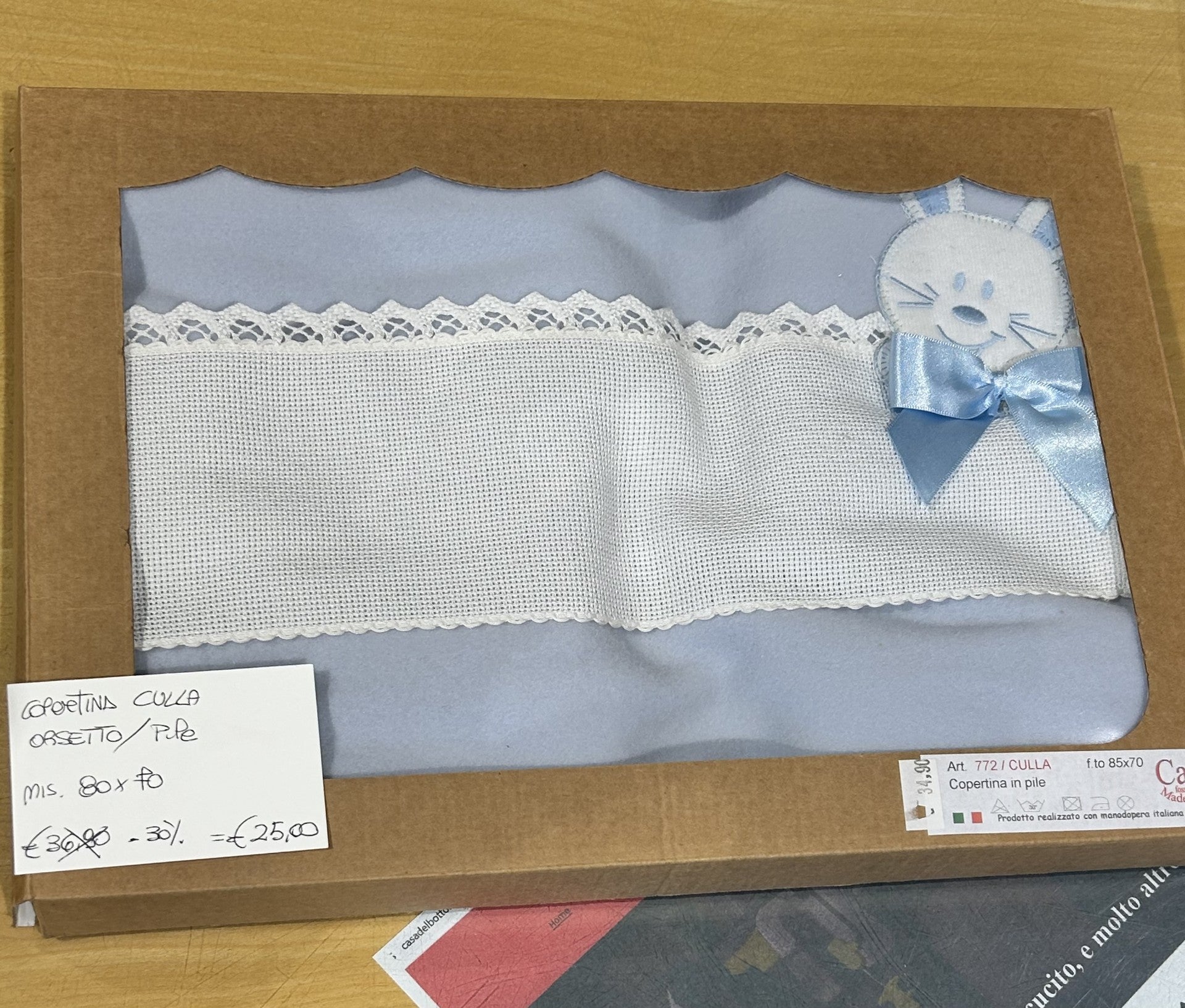 copertina in coral doppio (morbido pile) culla con coniglio CELESTE, ricamabile punto croce, 85x70 cm.