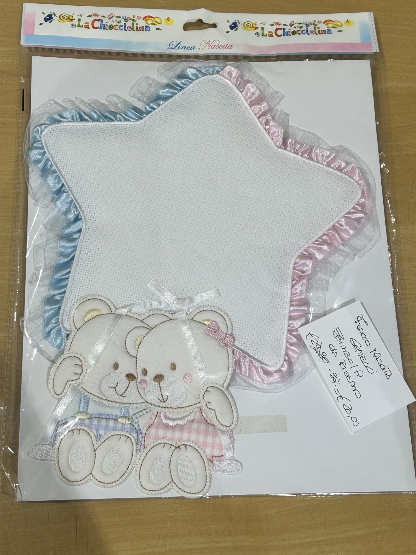 unico fiocco nascita per GEMELLI , metà lato azzurro , metà lato rosa , con due orsetti sull'altalena che si osservano - bordo in tela aida ricamabile a punto croce su tutta la dimensione della stella - by La Chiocciolina (Fossano)