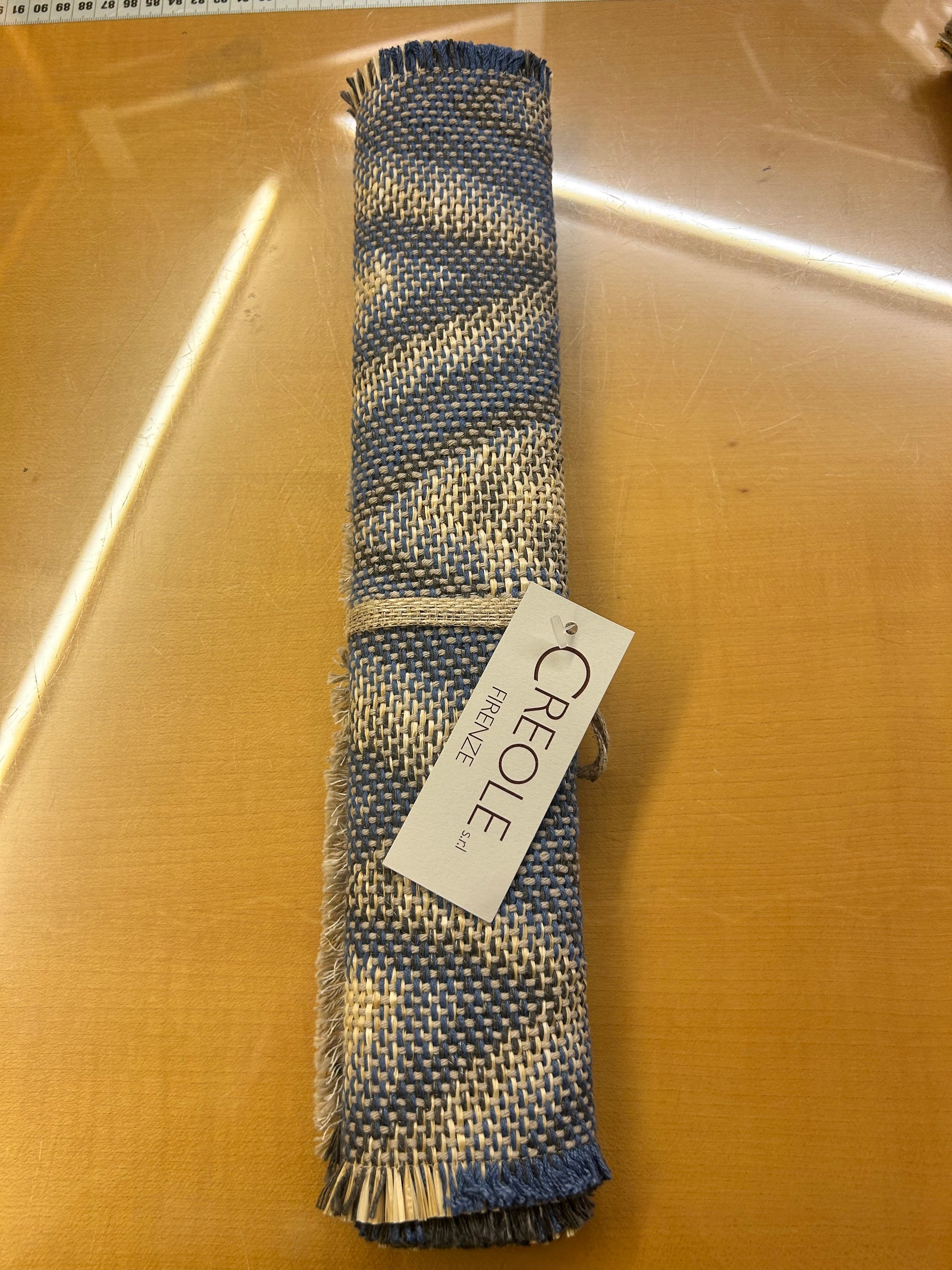 in cotone e poliestere , lavabile 30 c° , disponibili in nr.3 varianti colore: azzurro-giallo / beige-giallo (questi effetto rafia con lato lungo effetto frangia) e grigio scuro (no effetto rafia bordo ripiegato)
