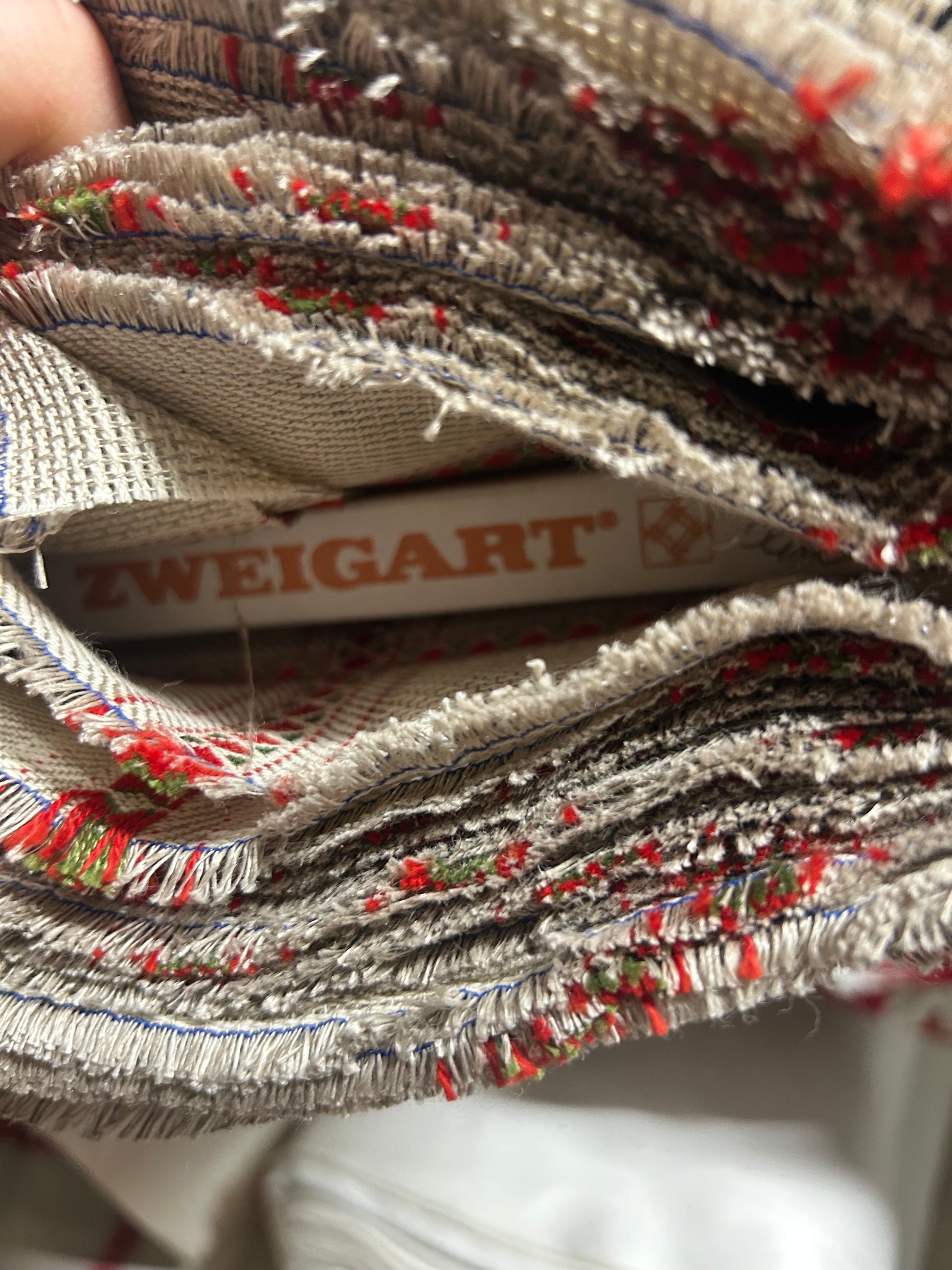 con decoro a rombi rossi su base verde, adatto per svariati tipi di punto (punto croce, mezzo punto e hardanger) - 100% Lino - € 49,90/MT. - Lino di qualità superiore e di una morbidezza incredibile - ormai quasi introvabile come tela (H.190 cm.) - lavabile in lavatrice delicati 30 c° - no centrifuga , dimensione massima di ogni quadretto interno 9cm. x 9cm.