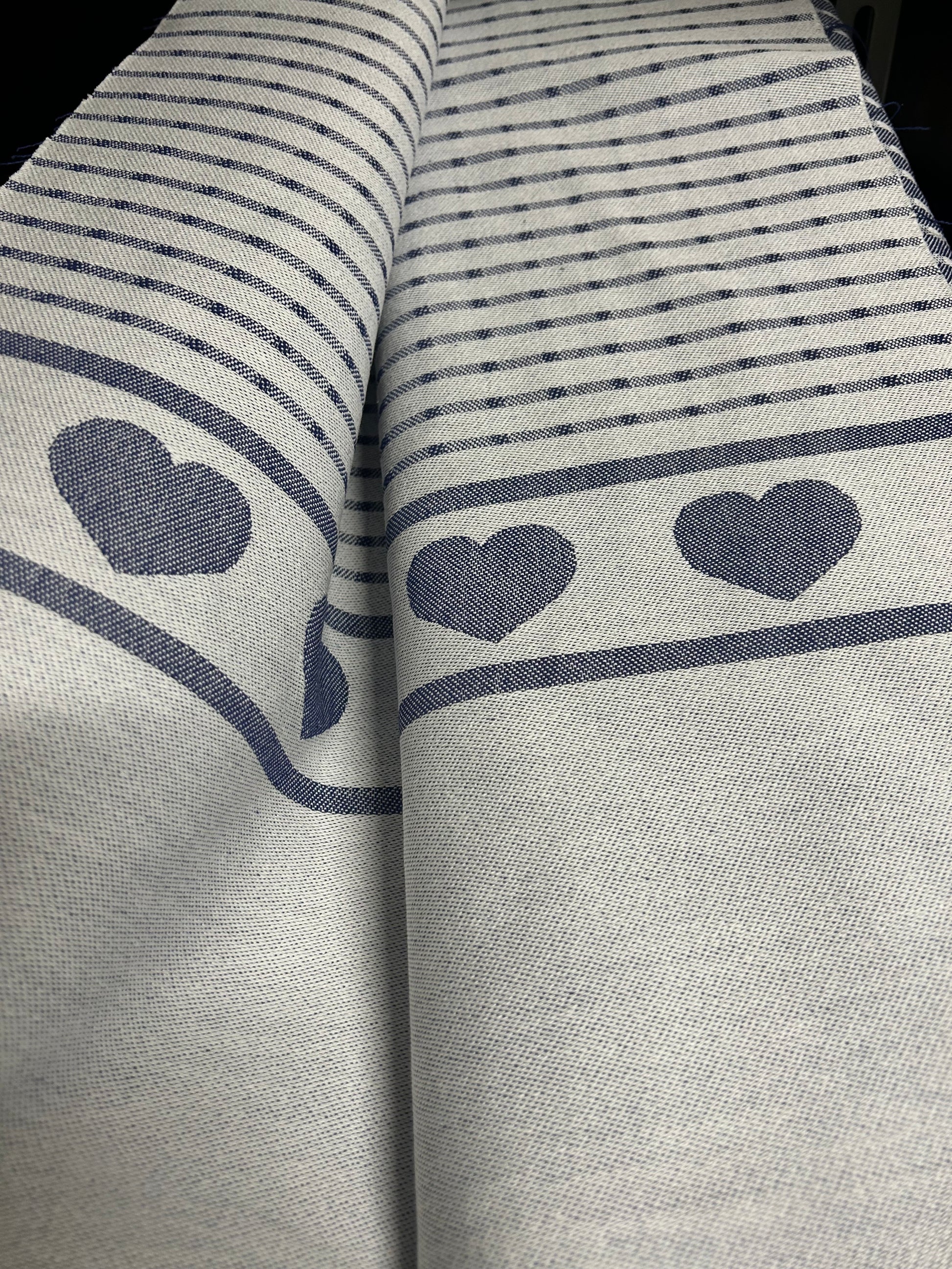 tessuto Halltex - Austria col. Blu Jeans in 100% Cotone H.150 cm. righe orizzontali e motivo a cuori sul fondo