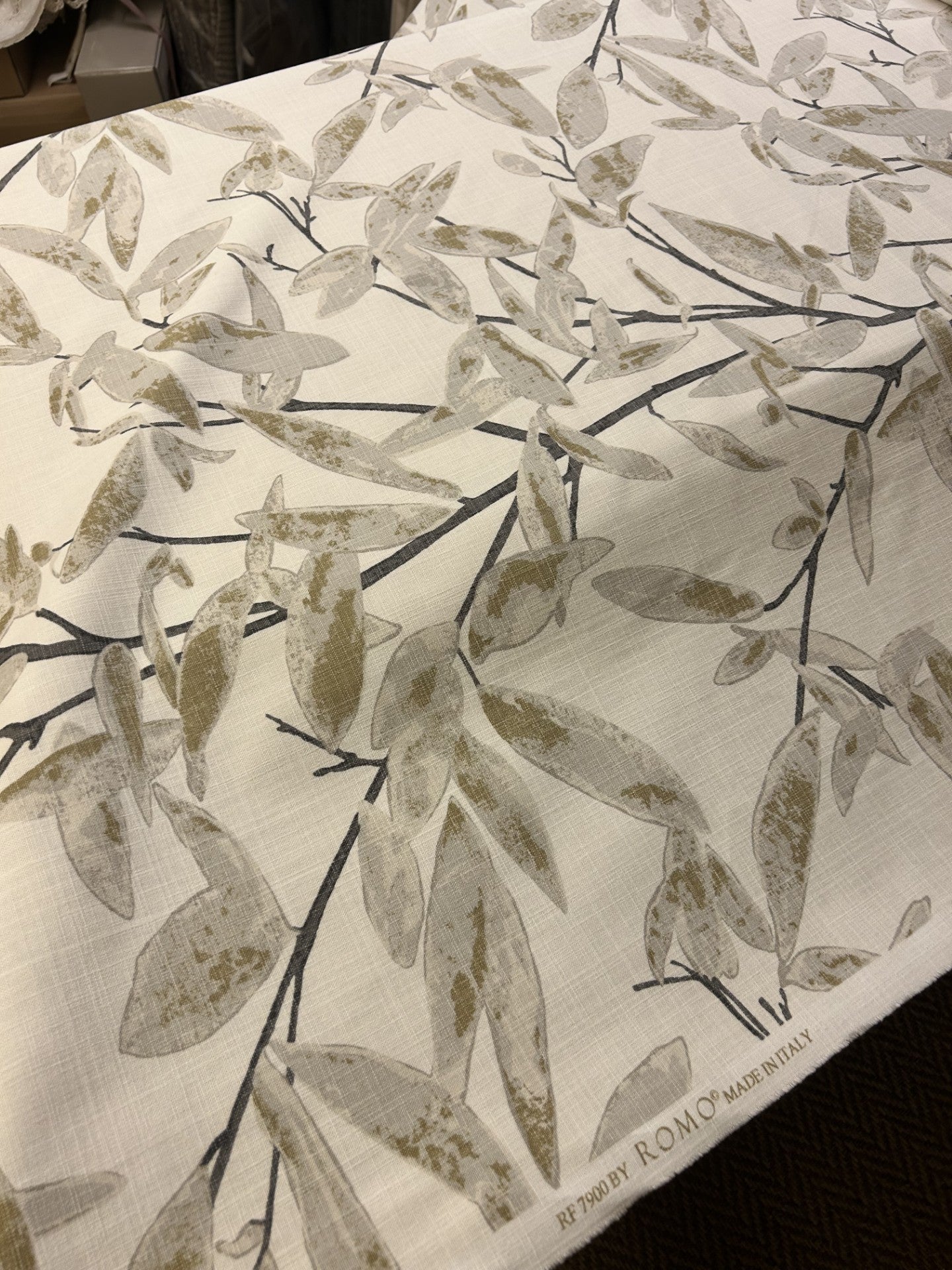 tessuto da arredamento H.140 stampa "fogliame" beige e avorio , Romo