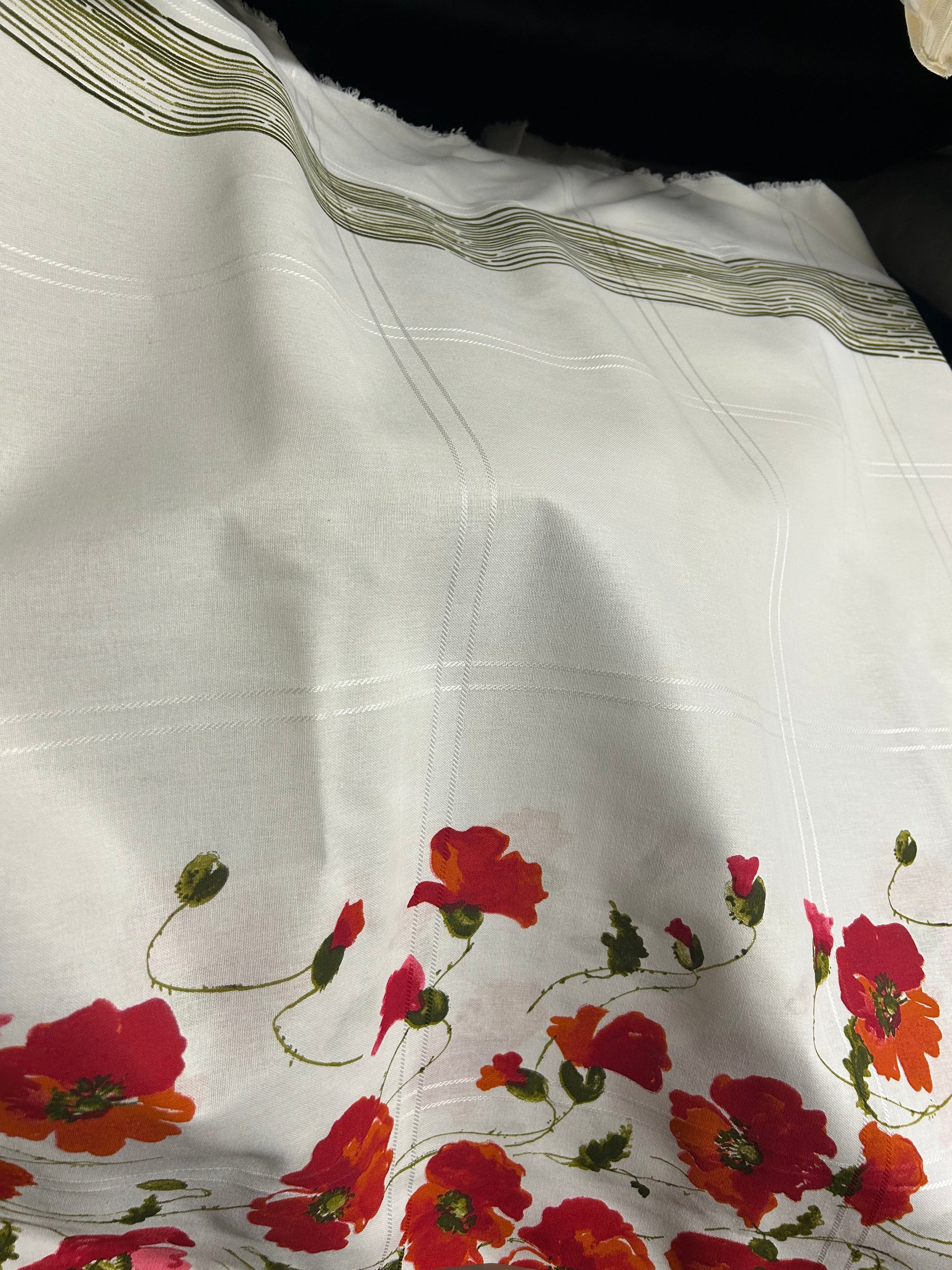 Made in Italy - morbidezza incredibile - decoro rigato verde orizzontale e papaveri col. rosso su base col. bianco e leggerissimo motivo a quadretti righe lucide tono su tono - adatto per qualsiasi utilizzo (creare tovaglie, runners e/o tovaglioli e molto altro) € 39,90/MT. - lavabile in lavatrice delicati 30 c°